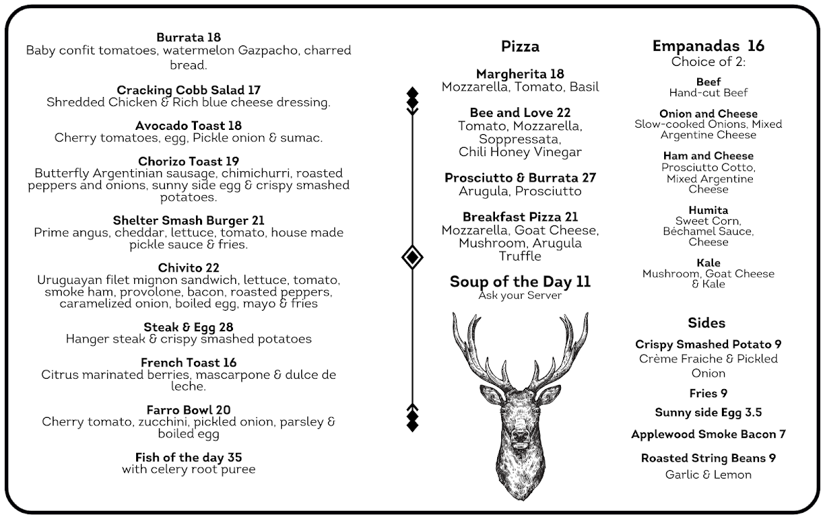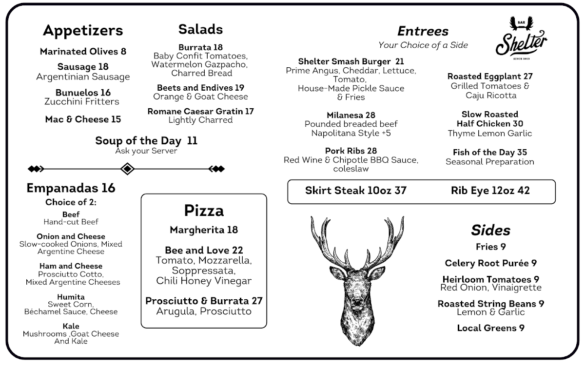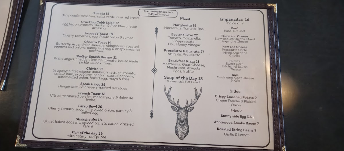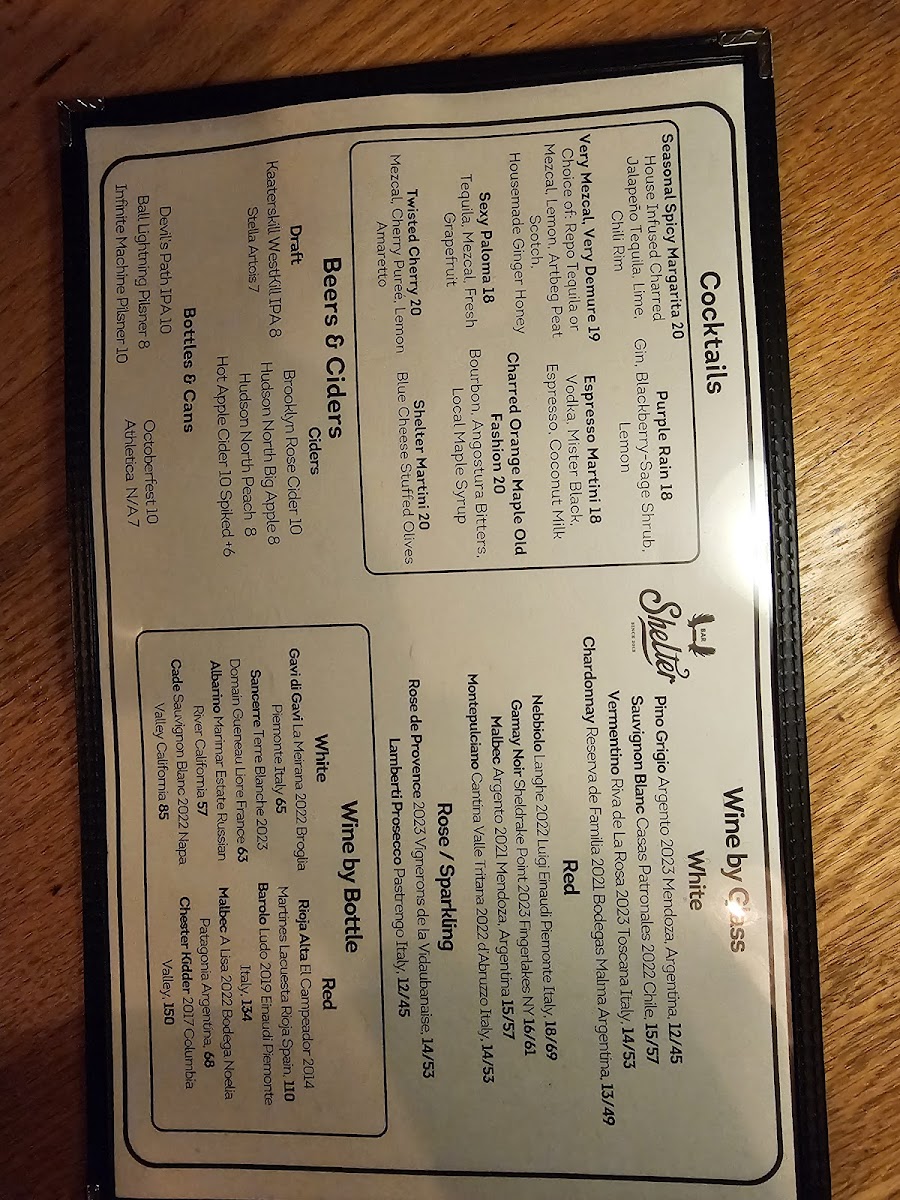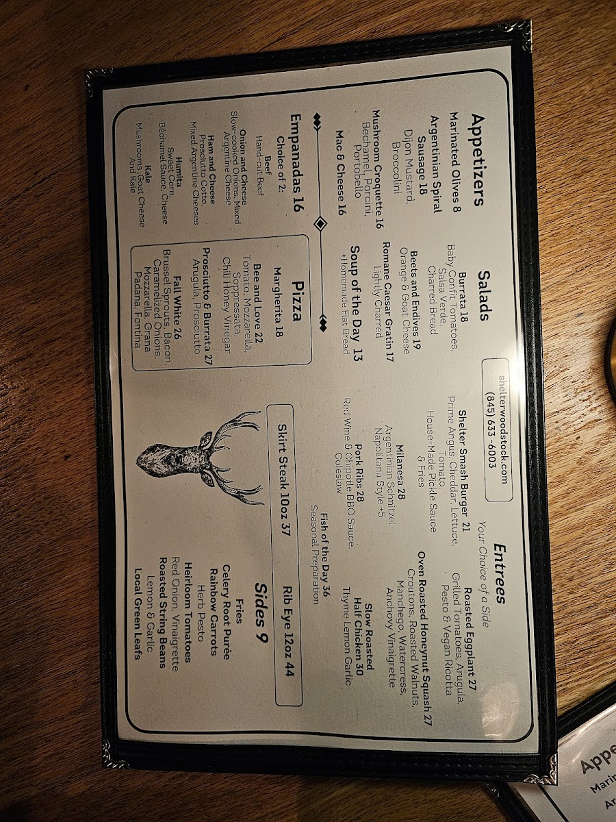 Step into a cozy retreat with the Shelter Woodstock Menu, offering a delightful blend of seasonal flavors and comforting favorites. Located in the heart of Woodstock, NY, this charming spot is all about quality ingredients prepared with care. Whether you’re craving something fresh and light or indulging in a hearty dish, the menu has something to satisfy every palate. Enjoy their range of savory mains, perfectly paired sides, and decadent desserts, all designed to create a memorable dining experience. The atmosphere is warm, the service attentive, and the food - simply delicious. So, if you're in the area, don’t miss the chance to enjoy an authentic and satisfying meal at Shelter Woodstock.